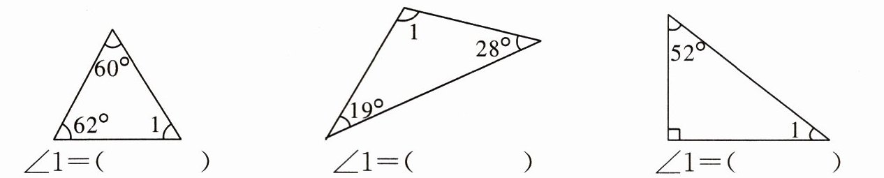 同样根据三角形内角和为$180^{\circ}$,已知两个角分别是$19^{\circ}$和$28^{\circ}$,所以$\angle1 = 180^{\circ}-19^{\circ}-28^{\circ}=133^{\circ}$。