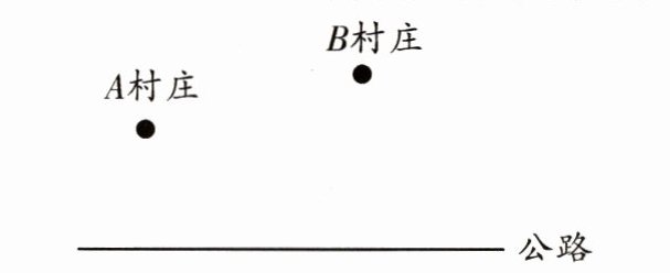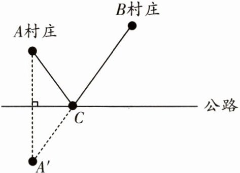 【解析】找出点 $ A $ 关于公路的对称点 $ A' $,$ A'B $ 与公路交于点 $ C $。连接 $ AC $,则 $ AC = A'C $。$ A'B = A'C + BC = AC + BC $,因为两点之间线段最短,所以停车场建在点 $ C $ 处可使停车场到 $ A $、$ B $ 两个村庄的距离之和最短。如图: