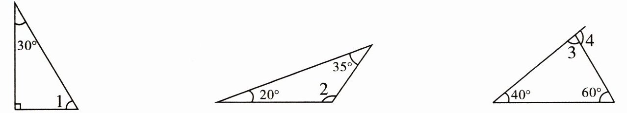 1. $∠1 = 180^{\circ} - 90^{\circ} - 30^{\circ} = 60^{\circ}$ $∠2 = 180^{\circ} - 35^{\circ} - 20^{\circ} = 125^{\circ}$ $∠3 = 180^{\circ} - 40^{\circ} - 60^{\circ} = 80^{\circ}$ $∠4 = 180^{\circ} - 80^{\circ} = 100^{\circ}$