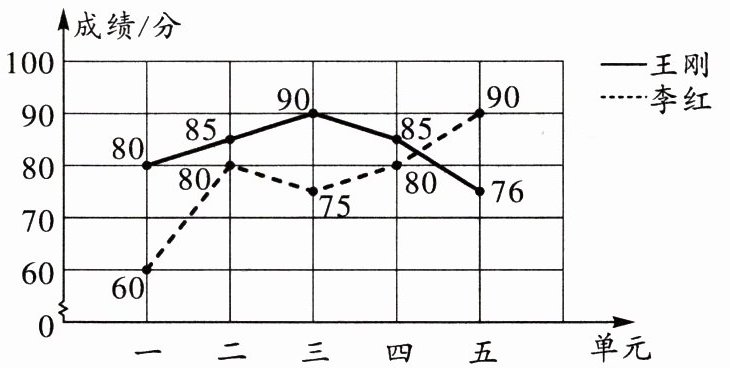 2. 右面是王刚和李红本学期1~5单元数学成绩统计图。