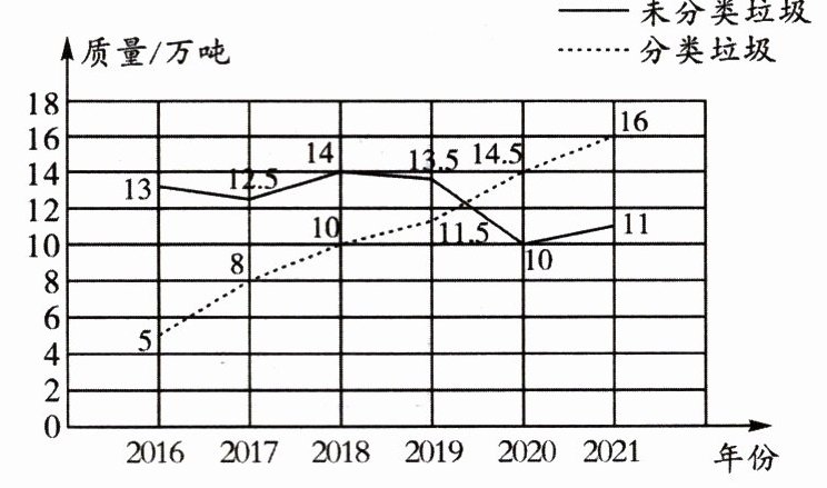 5. 某城市2016~2021年生活垃圾中分类垃圾与未分类垃圾质量如下图。