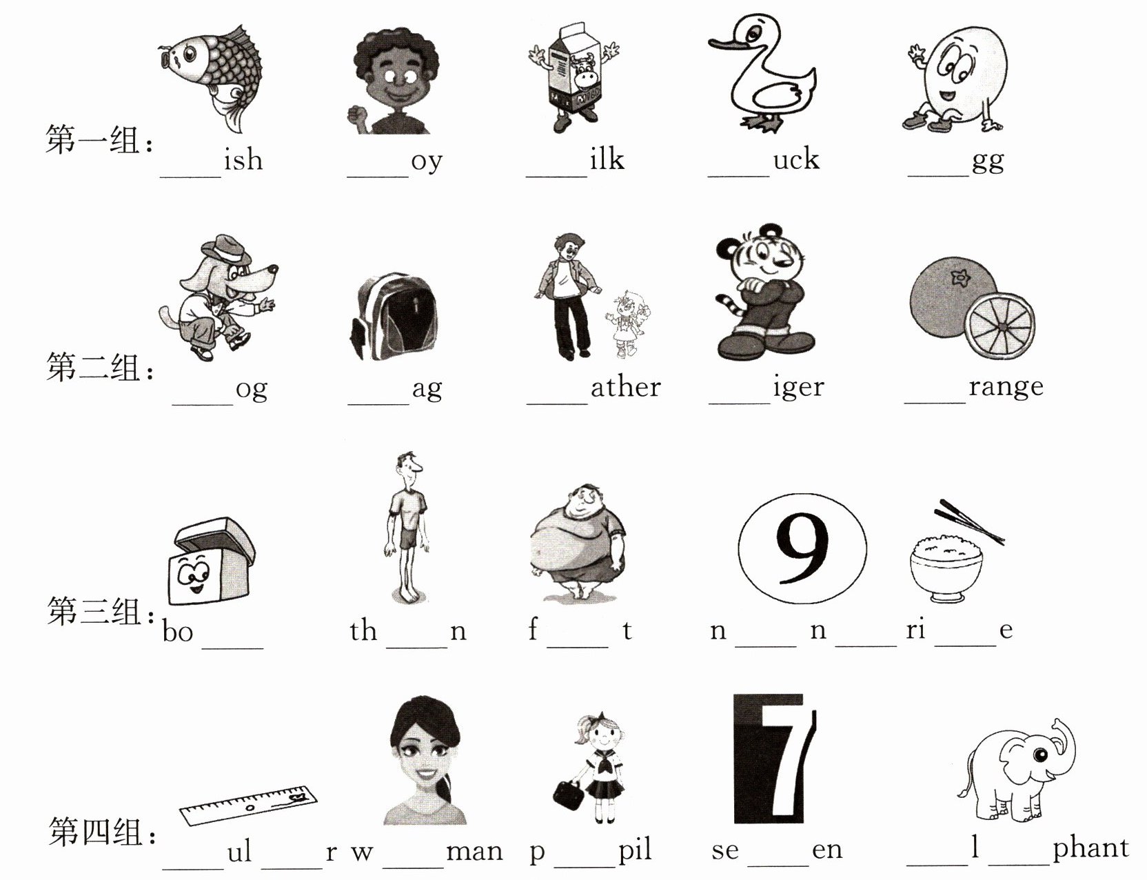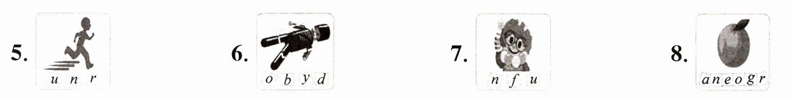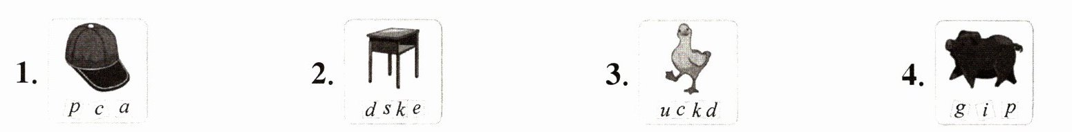 1. cap 2. desk 3. duck 4. pig 5. run 6. body 7. fun 8. orange
