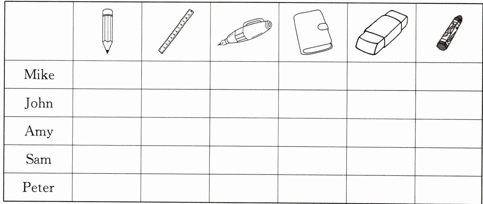 Look! How many notebooks(笔记本) do you see? I see nineteen notebooks. They are Mike's. John has thirteen pencils. Amy has twenty crayons. Sam has eleven rulers. Lisa has twelve pens. Peter has eighteen erasers. Miss White will take them to Xiwang School.