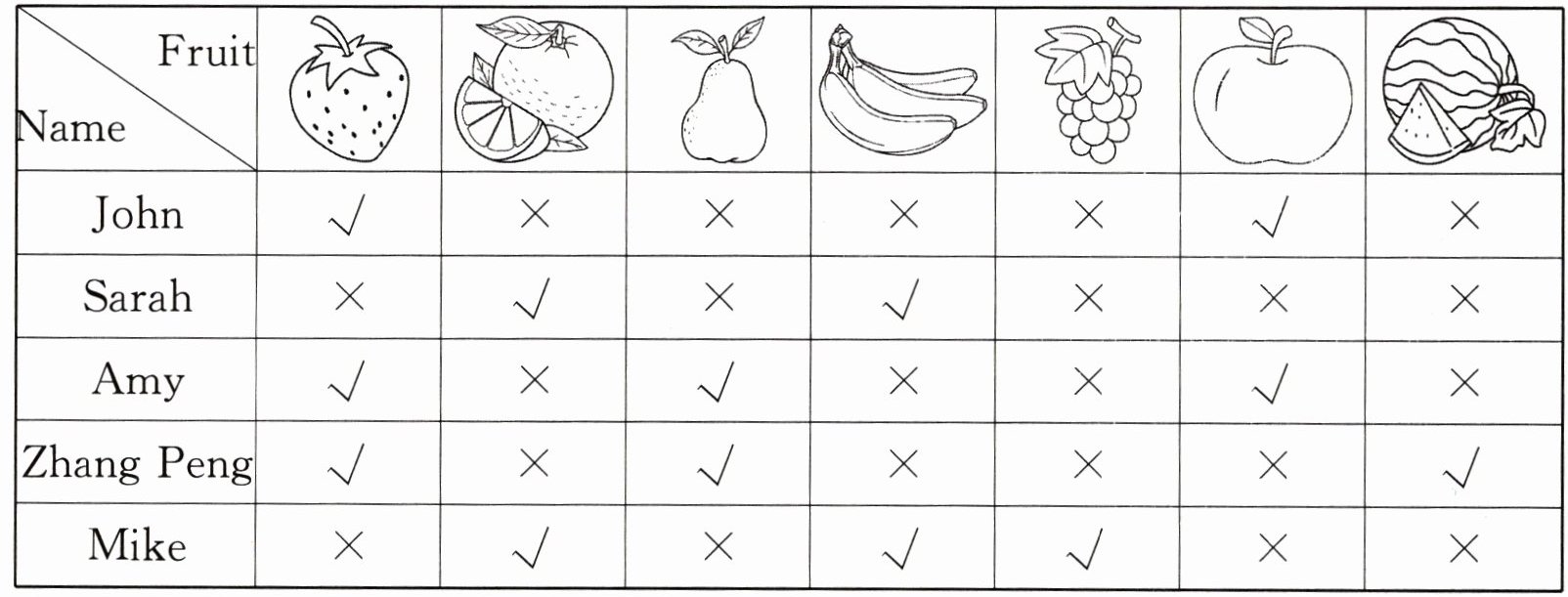 )4. Zhang Peng doesn't like oranges, bananas, pears or grapes.(