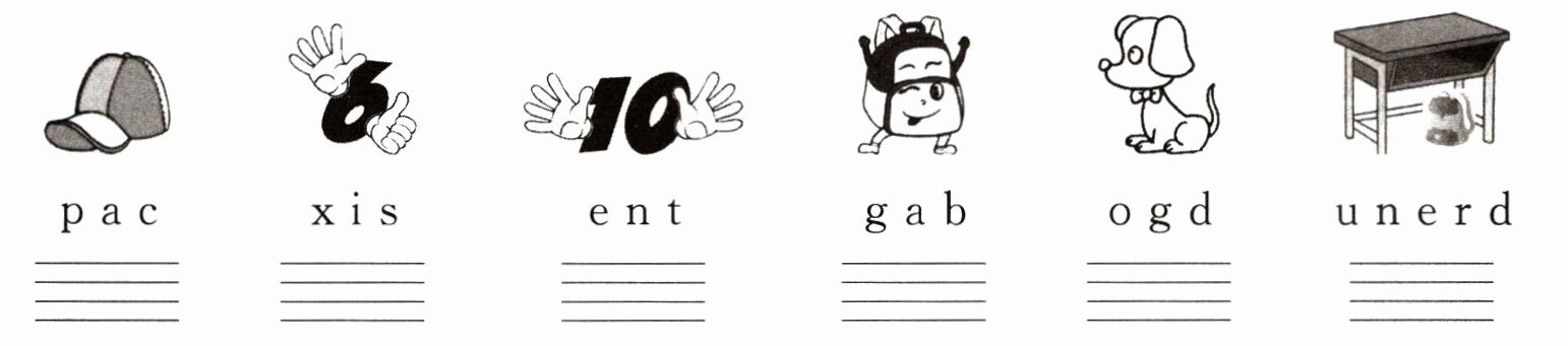六、看图想一想,将所给的字母排列成单词,写在四线三格内。