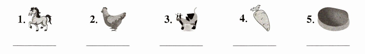 1. horse 2. hen 3. cow 4. carrot 5. potato