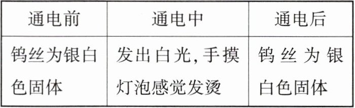 |钨丝为银白色固体|发出白光,手摸灯泡感觉发烫|钨丝为银白色固体|