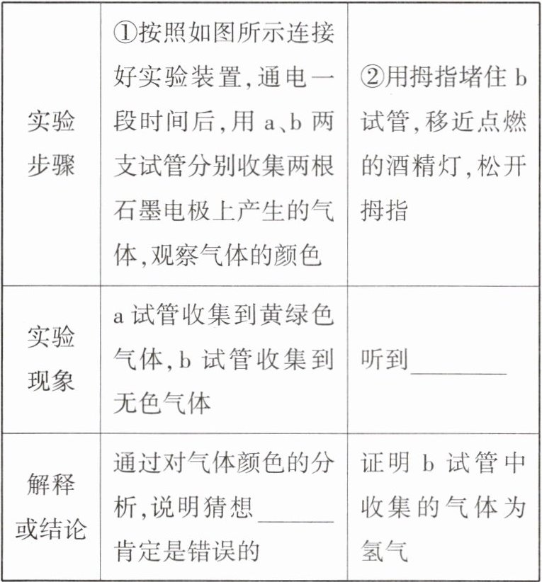 | 实验步骤 | ①按照如图所示连接好实验装置,通电一段时间后,用a、b两支试管分别收集两根石墨电极上产生的气体,观察气体的颜色 ②用拇指堵住b试管,移近点燃的酒精灯,松开拇指 |