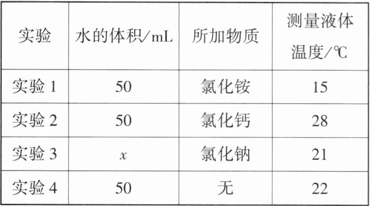 (1)本实验目的是探究氯化铵、氯化钙、氯化钠三种物质溶于水过程中的热量变化,因此水的量要相同,所以x=50 mL。