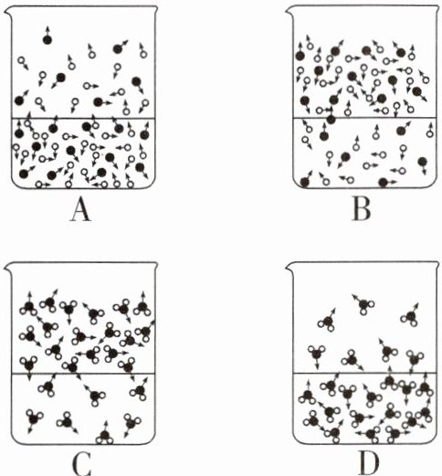 D 解析:水在蒸发时,液面以上单位体积内的水分子个数应该小于液面以下单位体积内的水分子个数,所以能反映水在空气中放置时发生变化的微观图示的是D。