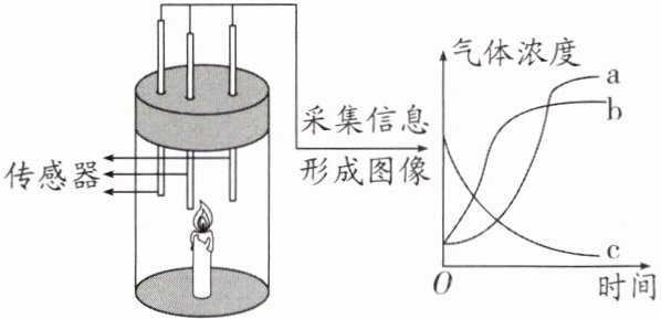 D 解析:蜡烛燃烧火焰分为外焰、内焰、焰心三层,外焰温度最高,A正确;从曲线c可看出,氧气的浓度到达一定的值后,就不会再发生改变了,说明氧气浓度小于一定值时,蜡烛无法继续燃烧,B正确;蜡烛燃烧消耗氧气,生成二氧化碳和水,则随着蜡烛燃烧,氧气含量慢慢减少,二氧化碳和水蒸气含量慢慢增加,则二氧化碳和水蒸气含量变化对应的曲线分别是a和b中的一条,C正确;蜡烛完全燃烧生成水和二氧化碳,不完全燃烧生成炭黑和一氧化碳,有气体生成,则该方法不可用于测定空气中氧气的体积分数,D错误。