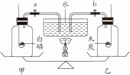 C 解析:白磷点燃后,应快速伸入集气瓶并塞紧橡皮塞,以防止瓶内气体受热逸出,造成实验误差,A错误;白磷燃烧生成五氧化二磷,木炭燃烧生成二氧化碳气体,则反应后甲中压强减小,打开弹簧夹a、b一段时间后,流入集气瓶中的水多,B错误;打开弹簧夹之前,甲、乙质量相等,打开弹簧夹后,进入甲中的水较多,则天平指针向左偏转,C正确;若白磷足量,由于氧气约占空气体积的五分之一,则集气瓶甲中消耗氧气的体积约为$\frac{1}{5}\ \text{L}$,D错误。