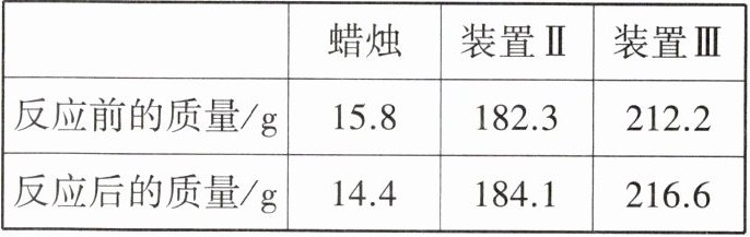 (1)浓硫酸有很强的吸水性,可以吸收蜡烛燃烧后产生的水蒸气;氢氧化钠和氧化钙固体可吸收蜡烛燃烧后生成的二氧化碳气体,所以装置Ⅱ和装置Ⅲ增加的质量分别是水和二氧化碳的质量,测得水的质量为184.1 g-182.3 g=1.8 g;测得二氧化碳的质量为216.6 g-212.2 g=4.4 g。