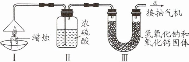 实验步骤如下:先分别称量装置Ⅰ中蜡烛、装置Ⅱ、装置Ⅲ的质量。按图示连接好仪器,点燃蜡烛,同时从a导管抽气。一段时间后熄灭蜡烛,再分别称量装置Ⅰ中蜡烛、装置Ⅱ、装置Ⅲ的质量(提示:浓硫酸只吸收水,氢氧化钠和氧化钙固体既可以吸收水分也可以吸收二氧化碳)。实验数据如下表: