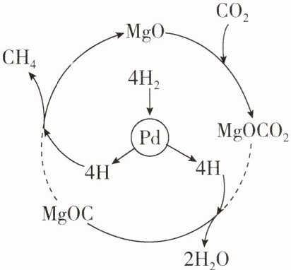 $12. CO_2$与$H_2$在一定条件下转化为$CH_4($反应过程如图所示,虚线处部分中间产物略去),可实现$CO_2$的再利用。下列说法不正确的是 (