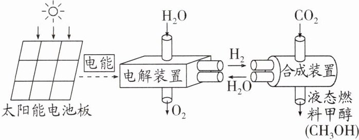 15. (2024·菏泽期末)杭州亚运会主火炬塔使用废碳再生的绿色甲醇(化学式为$CH_3OH)$做燃料。该燃料的生产过程由太阳能光伏发电、电解水制氢、二氧化碳加氢在一定的条件下合成绿色液态燃料甲醇三大系统单元构成,总投资约1.41亿元。该项目的工艺流程如下图:
