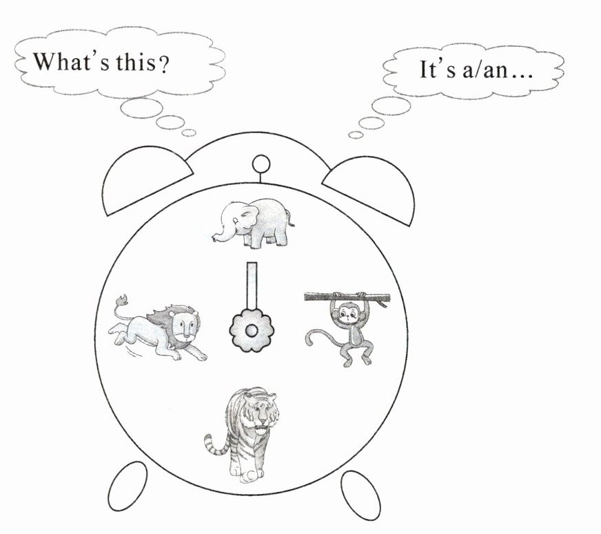 看看下面的小闹钟,在下列时间时针指向的是什么动物? 请将英文单词写在四线格内,并用下列句型与朋友交流一下。