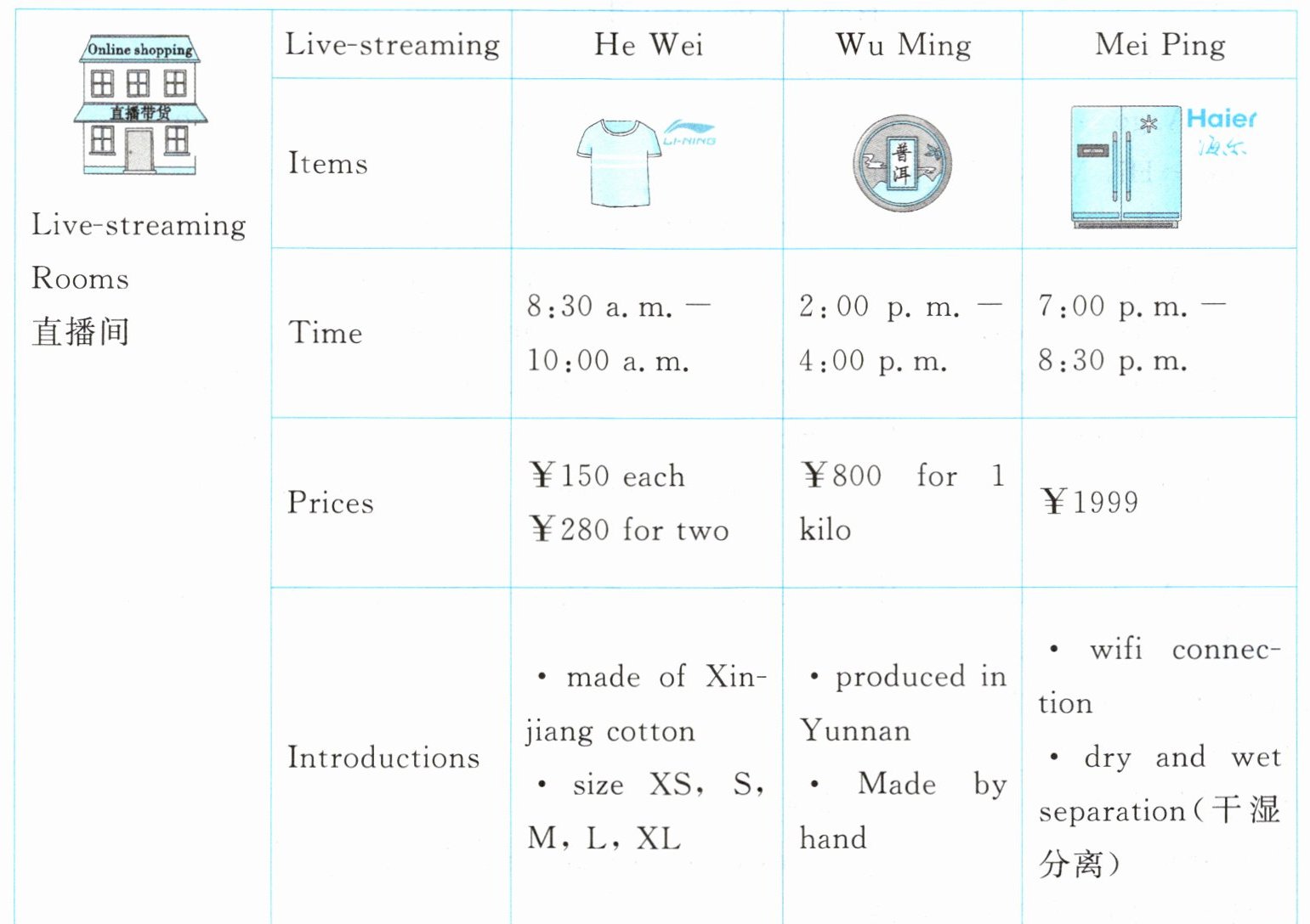 Ⅲ. (湖南岳阳最新中考题改编)下面三位博主将在明天的不同时段直播带货,一起来看看他们直播间的详细信息吧。阅读表格信息,选择正确的答案。