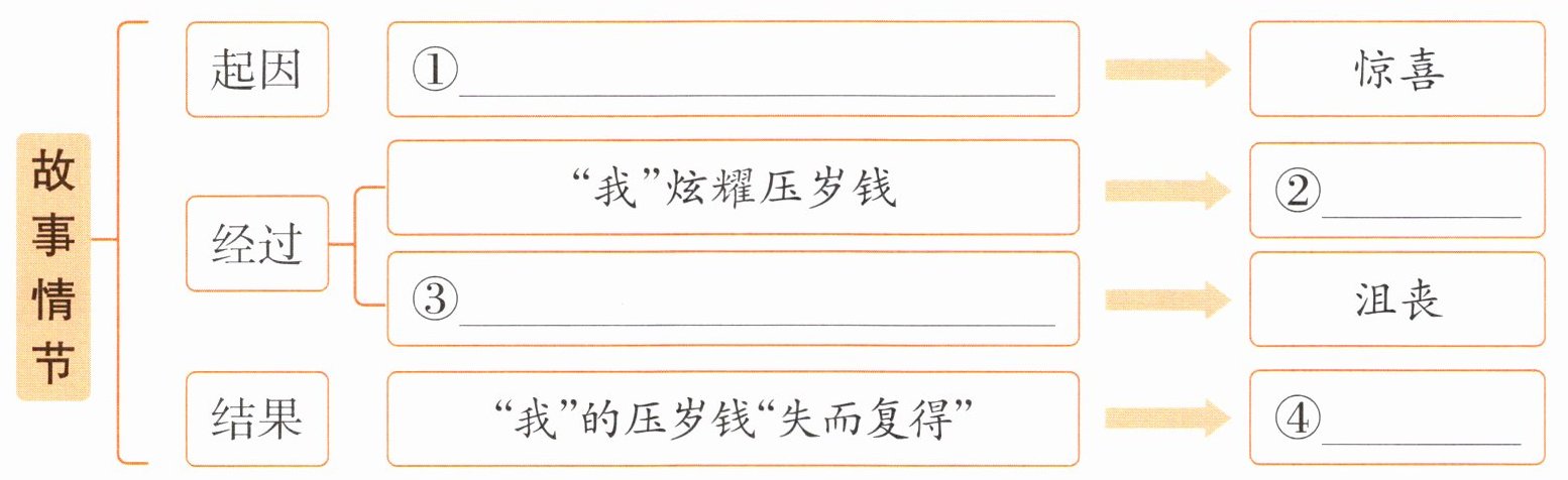 1①“我”收到压岁钱②得意③“我”丢失并寻找压岁钱④高兴
