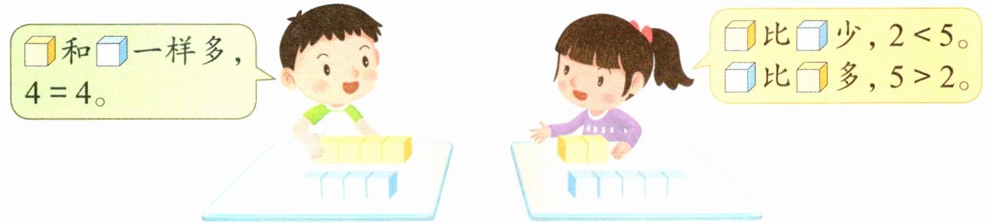 左边摆$4$个正方体,右边摆$4$个正方体,左右两边一样多,$4 = 4$;