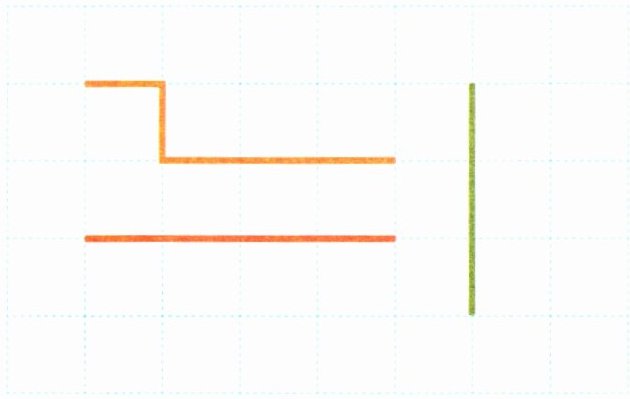 橙色的线在水平方向上占据了多个格子的边,经过数格子边可知其长度较长;绿色的线只占据了几个格子的边,长度明显较短。