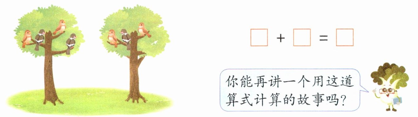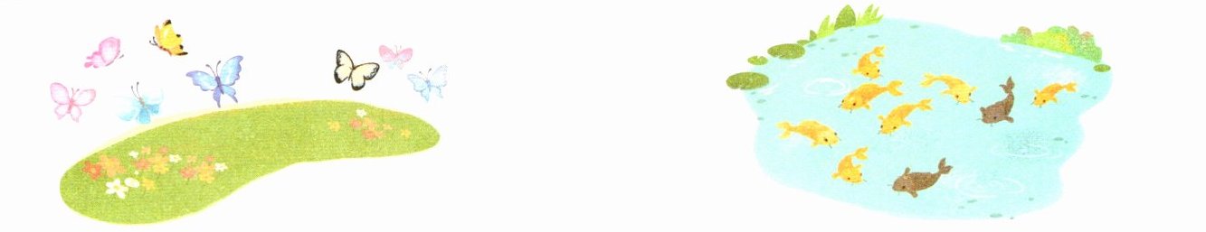 图中左边有$7$条鱼,右边有$2$条鱼,可列出$7 + 2 = 9$;