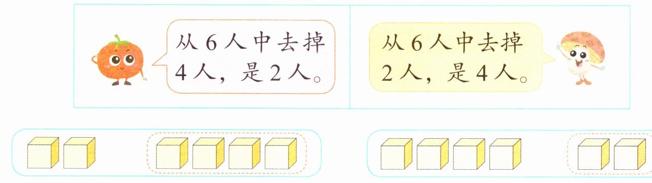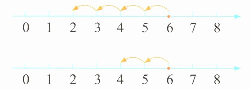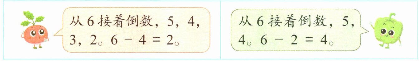 计算$6 - 2$时,同样可以用倒着数的方法,从6开始倒着数2个数,分别是5,4,所以$6 - 2 = 4$;也可以用数的组成,6可以分成2和4,所以$6 - 2 = 4$。