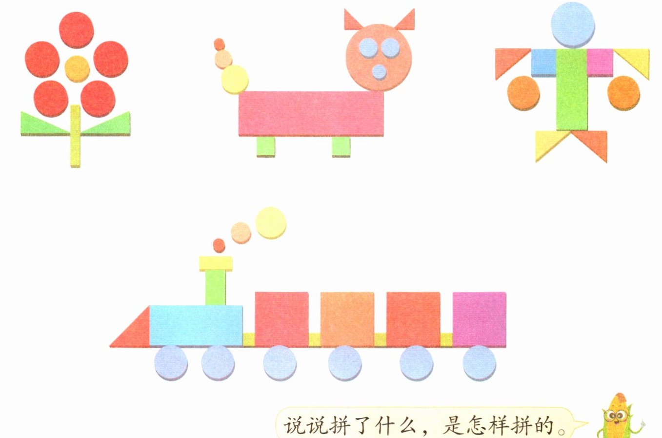 示例:拼出的是花朵,用了1张圆形做花心,6张半圆形做花瓣,2张长方形做叶子。