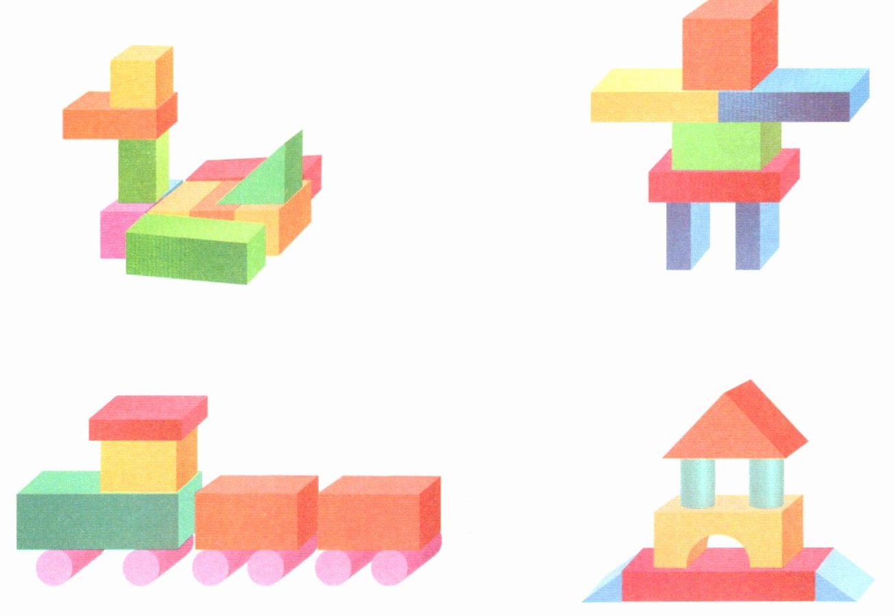 示例:用了长方体、正方体、圆柱和球;其中长方体10块,正方体1块,圆柱4块,球1个。