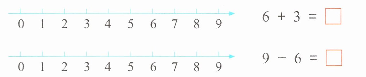 解析:本题主要考查10以内数的加减法,通过数轴来直观地理解加法和减法的运算。对于$6 + 3$,从数轴上6的位置开始,向右数3个单位,得到结果9;对于$9 - 6$,从数轴上9的位置开始,向左数6个单位,得到结果3。