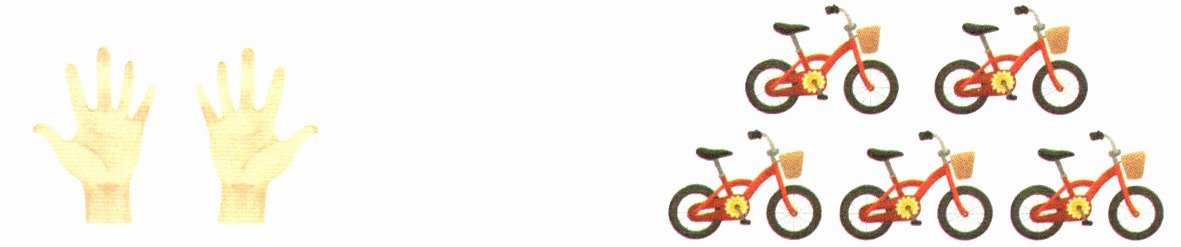 解析:本题主要考查10以内数的认识及简单的乘法运算。对于“1双手有几根手指”,通过观察可知1双手有2只手,每只手有5根手指,那么手指总数为$2×5 = 10$根;对于“5辆自行车有几个车轮”,因为每辆自行车有2个车轮,所以5辆自行车的车轮数为$5×2 = 10$个。