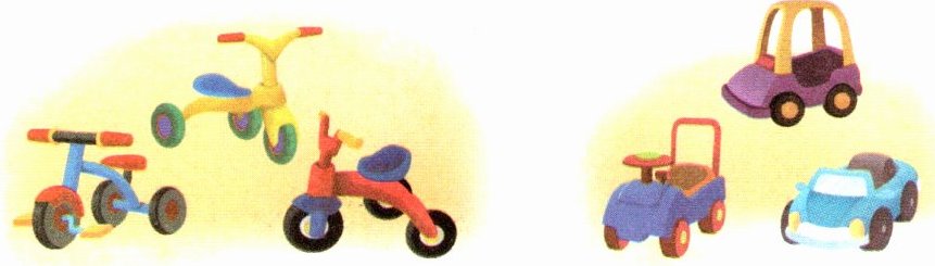 5. 3辆三轮车一共有多少个轮子?3辆四轮车呢?