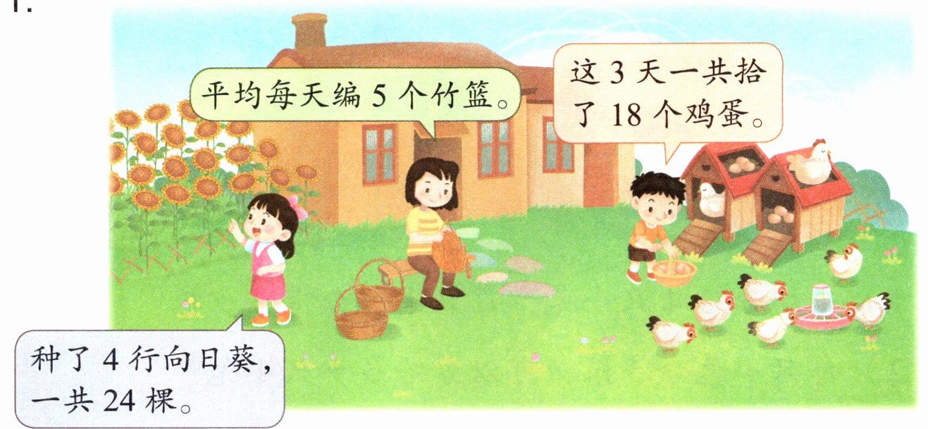 (2)已知平均每天编$5$个竹篮,要求$3$天编的竹篮数,就是求$3$个$5$是多少,用乘法计算。