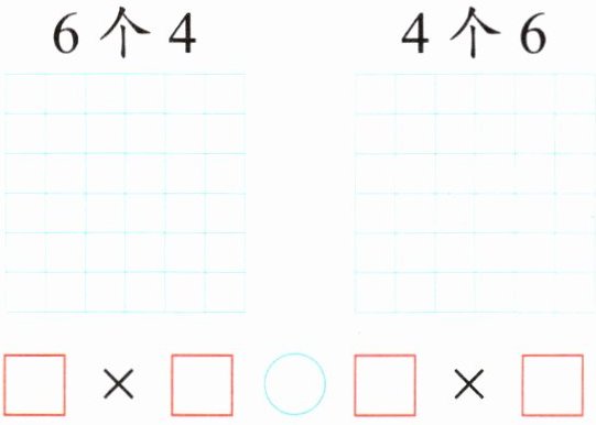答案:$4$;$×$;$6$;$=$;$6$;$×$;$4$。图略(在左边方格图中给$6$行每行$4$个方格涂色,在右边方格图中给$4$行每行$6$个方格涂色)