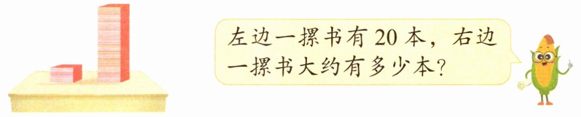 玉米:左边一摞书有20本,右边一摞书大约有多少本?