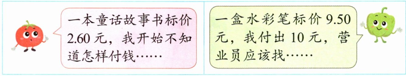 一本童话故事书标价2.60元,我开始不知道怎样付钱…… 一盒水彩笔标价9.50元,我付出10元,营业员应该找……