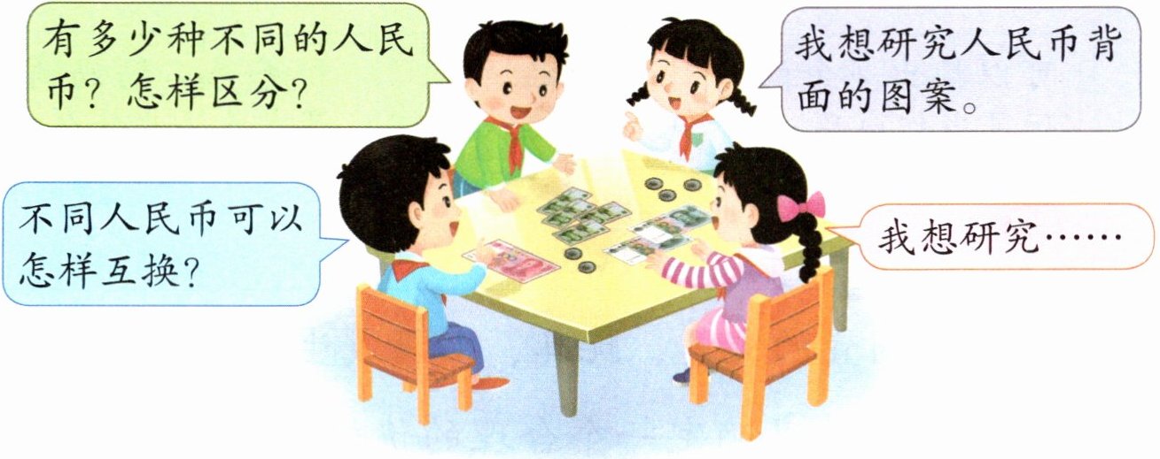 观察小组同学带来的人民币,互相说说,要认识人民币需要研究哪些问题。