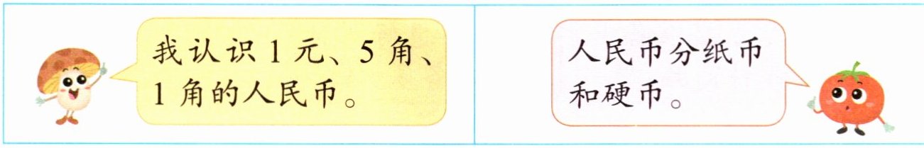 我认识1元、5角、1角的人民币。 人民币分纸币和硬币。