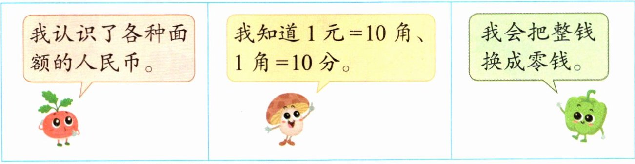 我认识了各种面额的人民币。 我知道1元= 10角、1角= 10分。 我会把整钱换成零钱。