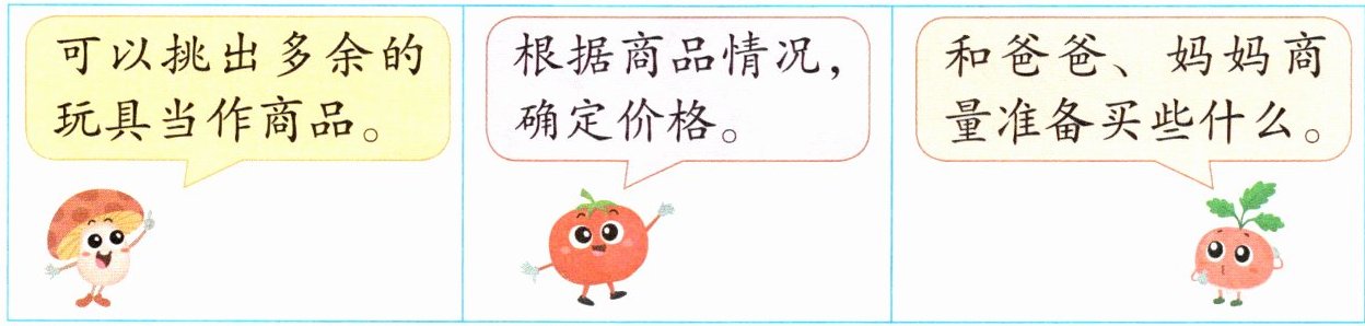可以挑出多余的玩具当作商品。 根据商品情况,确定价格。 和爸爸、妈妈商量准备买些什么。