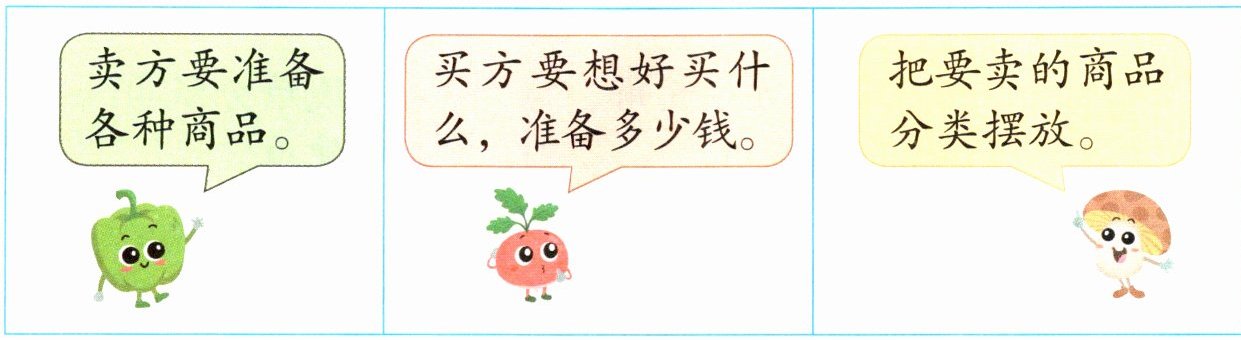 卖方要准备各种商品。 买方要想好买什么,准备多少钱。 把要卖的商品分类摆放。