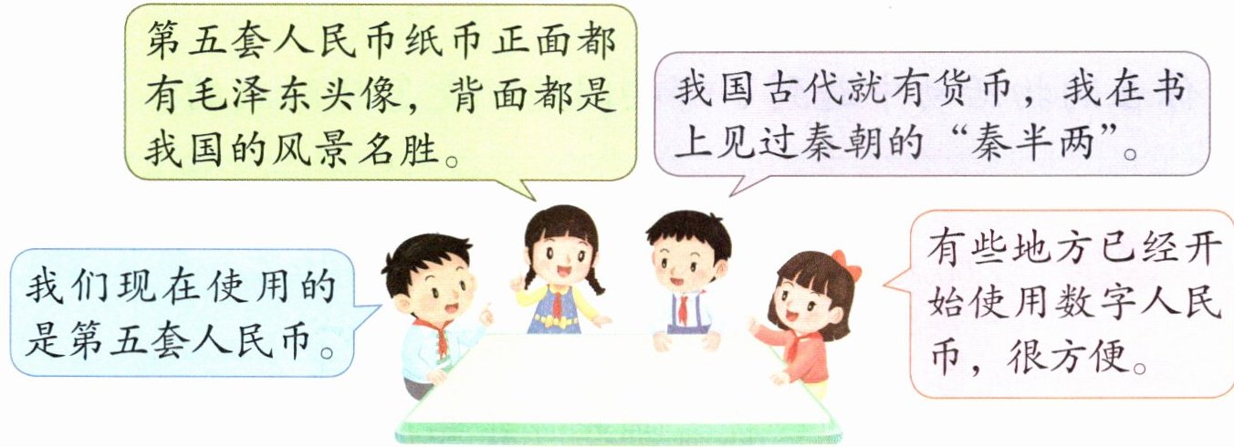 第五套人民币纸币正面都有毛泽东头像,背面都是我国的风景名胜。 我国古代就有货币,我在书上见过秦朝的“秦半两”。 我们现在使用的是第五套人民币。 有些地方已经开始使用数字人民币,很方便。