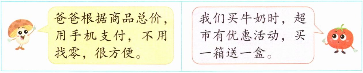 爸爸根据商品总价,用手机支付,不用找零,很方便。 我们买牛奶时,超市有优惠活动,买一箱送一盒。