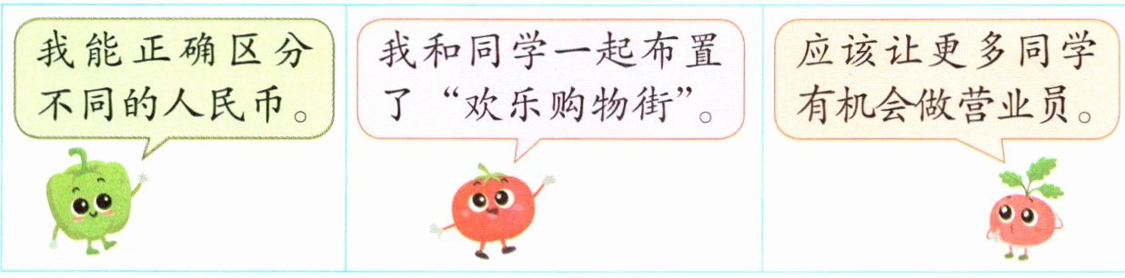 我能正确区分不同的人民币。 我和同学一起布置了“欢乐购物街”。 应该让更多同学有机会做营业员。