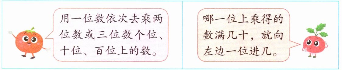 用一位数依次去乘两位数或三位数个位、十位、百位上的数。哪一位上乘得的数满几十,就向左边一位进几。