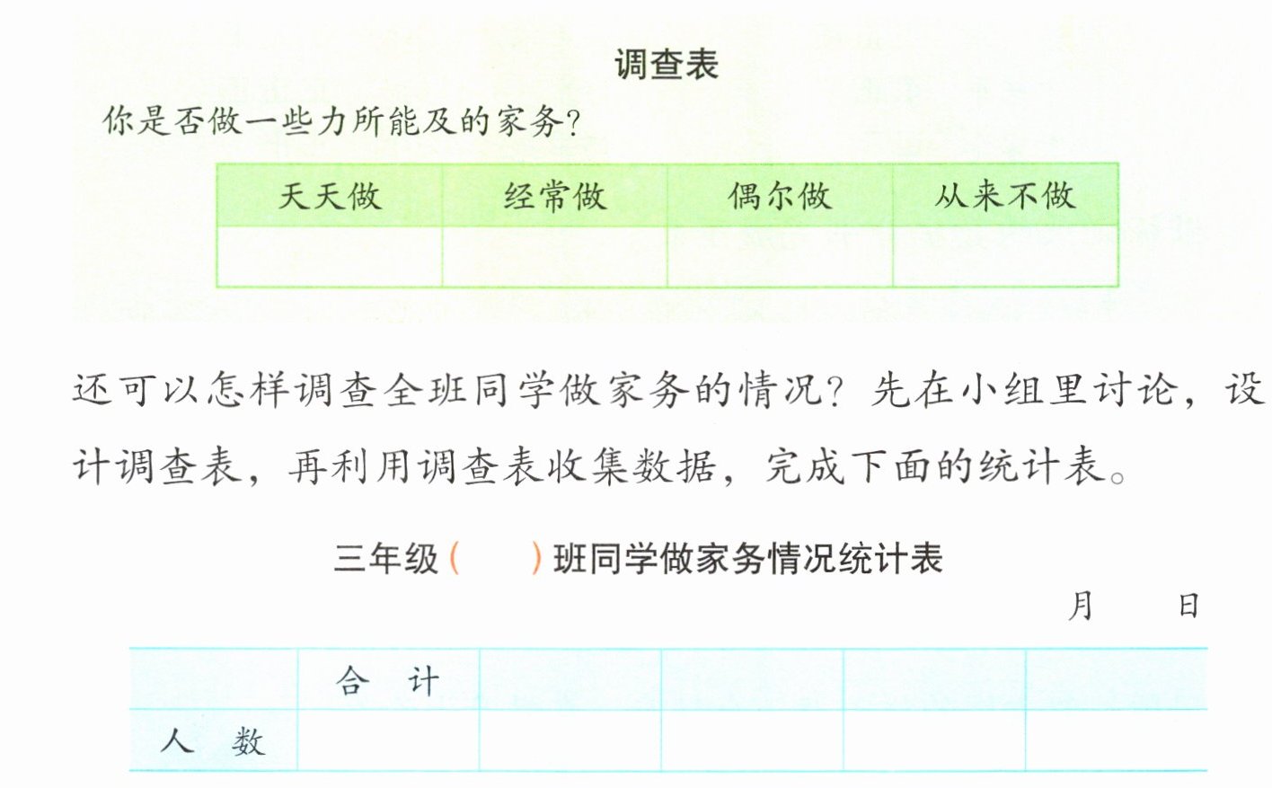 根据小明提出的这三个问题,分别设计调查表,记录数据,并分类整理。