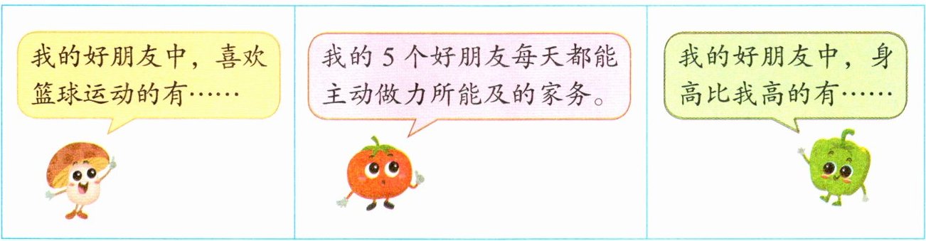通过对数据的整理和分析,我了解到我的好朋友中,喜欢篮球运动的有1人;我的5个好朋友每天都能主动做力所能及的家务;我的好朋友中,身高比我高的有2人。