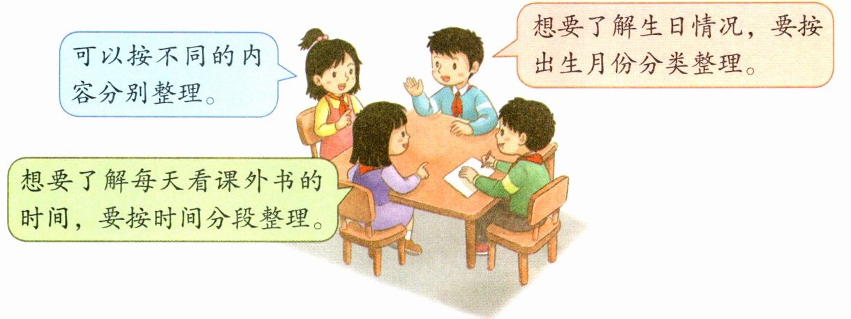 我的调查完成了。可以按不同的内容分别整理,想要了解生日情况,要按出生月份分类整理;想要了解每天看课外书的时间,要按时间分段整理。
