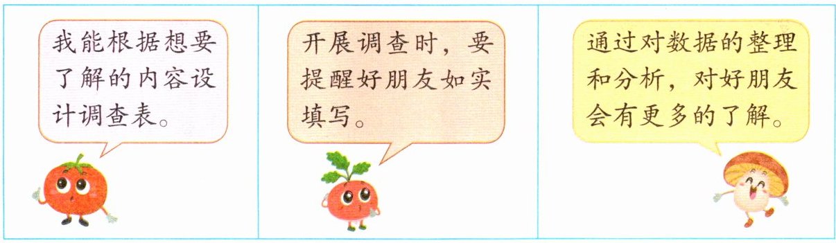 在开展调查和分析数据的过程中,我的体会是我能根据想要了解的内容设计调查表;开展调查时,要提醒好朋友如实填写;通过对数据的整理和分析,对好朋友会有更多的了解。