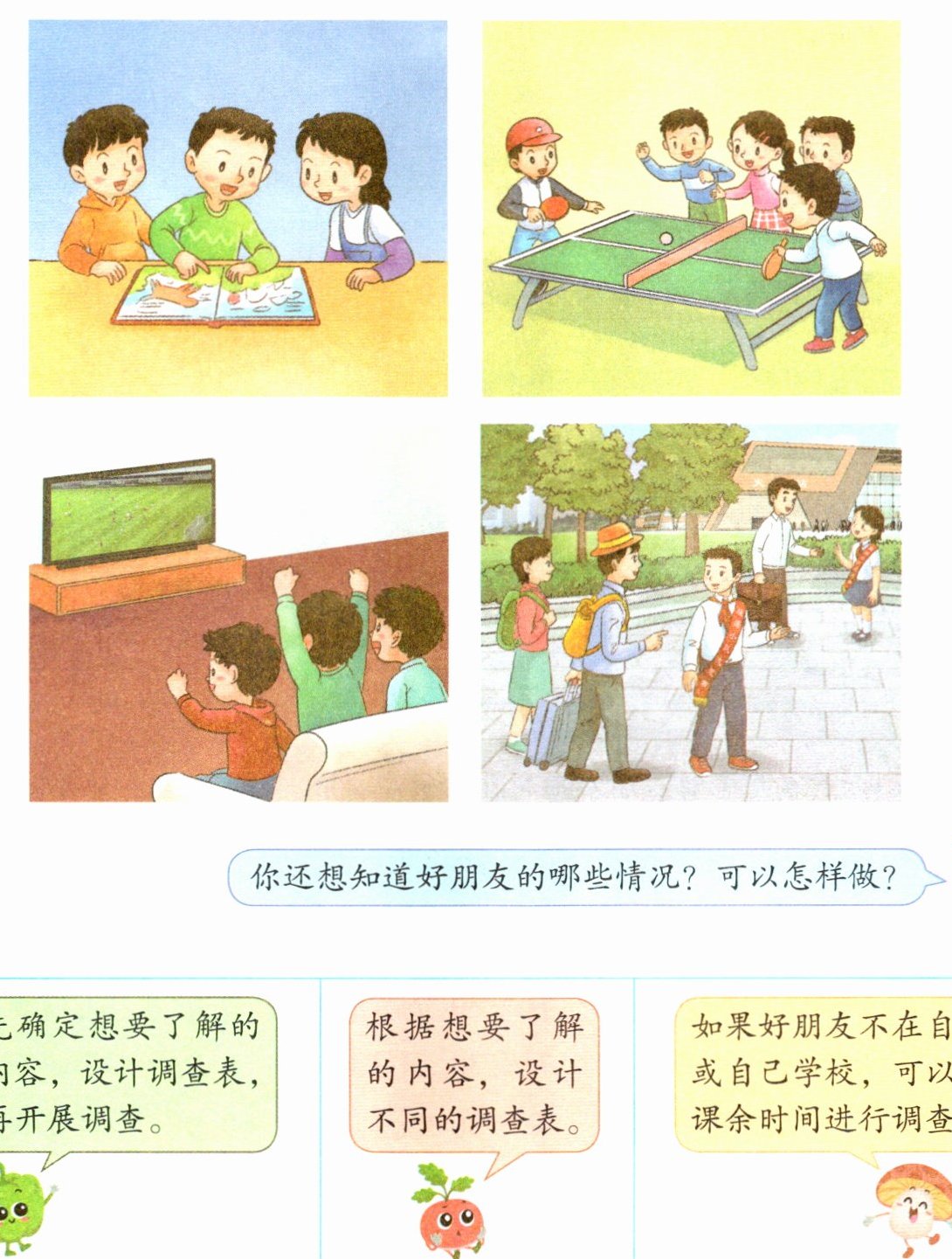 我还想知道好朋友最喜欢的运动项目、颜色和课程。可以先确定想要了解的内容,设计调查表,再开展调查。